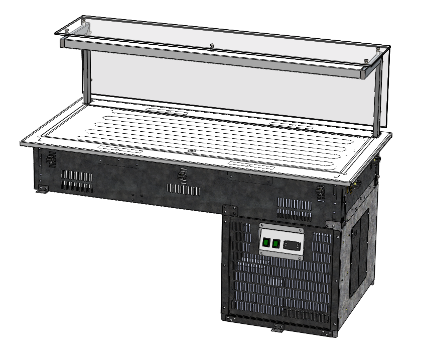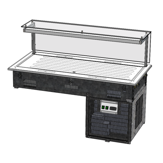 Прилавок с охлаждаемой поверхностью встраиваемый к линии «Drop IN» торговой марки «Refettorio». Предназначен для кратковременного хранения пищевых продуктов, демонстрации и раздачи холодных закусок, третьих блюд и охлажденных напитков потребителю. Столешница из нержавеющей стали. Класс прилавка высокотемпературный (от 1° до 10). Холодообеспечение встроенное. Тип оттаивания: естественный. Мармит оснащен стеклянной полкой. Максимальная распределенная нагрузка на стеклянную полку 10кг.