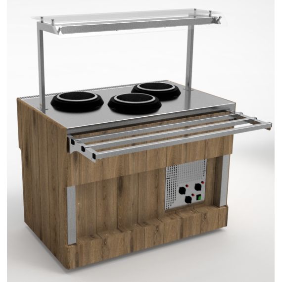 Мармит для первых блюд/шведский стол с двумя электросупницами предназначен для поддержания в горячем состоянии емкостей с первыми блюдами и раздачи их потребителю. Вместимость супницы - 10 литров. Исполнение - пристенное. Оснащен стеклоизделиями, которые входят в комплект стандартной поставки. Терморегулятор от 0 до 95С°. Теплоноситель - паровая рубашка. Электросупницы - 3шт. Мощность одной электросупницы, 0,4 кВт Мармит имеет светодиодную подсветку в нише фасадной части и подсветку рабочей зоны. Напряжение: 220/380, В. Мощность: 0,809кВт. Мармит имеет светодиодную подсветку в нише фасадной части и подсветку рабочей зоны. Включение и отключение подсветки происходит путём нажатия на переключатель расположеный на панели модуля. Фасадные панели других цветов и текстур можно заказать по образцам изготовителя. Материал фасадных панелей – МДФ.