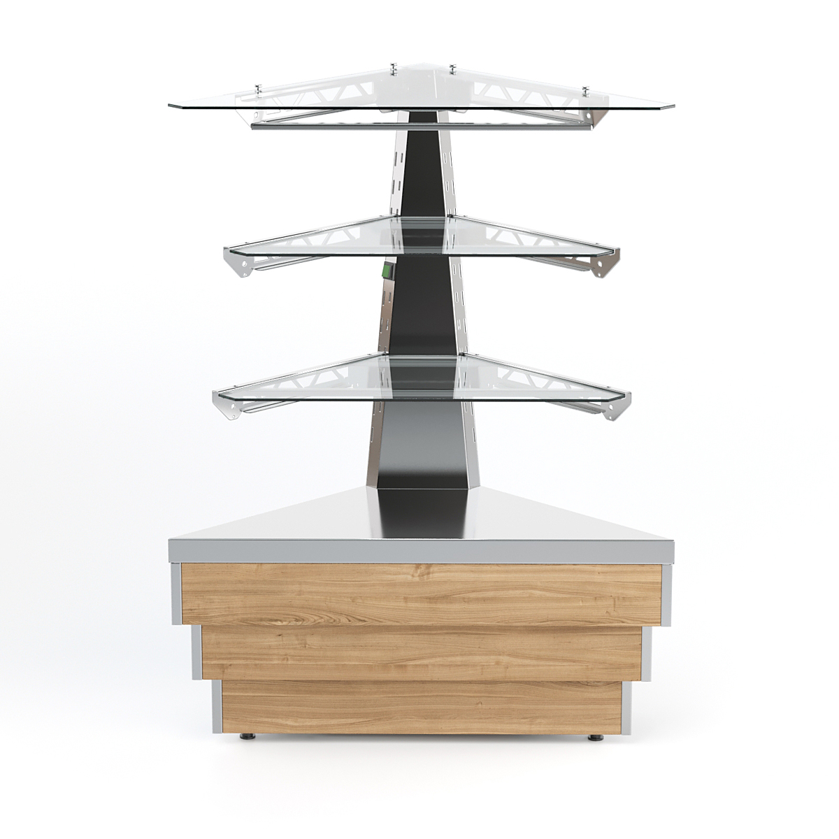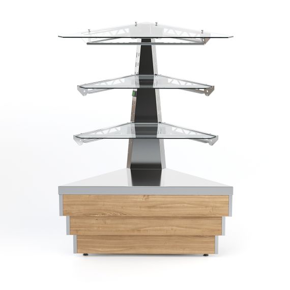 Кондитерская витрина нейтральная угловая торговой марки «Refettorio». Используется для удобства комплектации модулей под углом 90 градусов в линию витрин, является промежуточным вспомогательным элементом. Витрина с открытым доступом к продуктам. Размещение пищевых продуктов полочное трёхъярусное, включая дно полезного объёма. Имеет освещение рабочей зоны над каждой полкой. В стандартный комплект поставки фасады не поставляются (доп. опция).