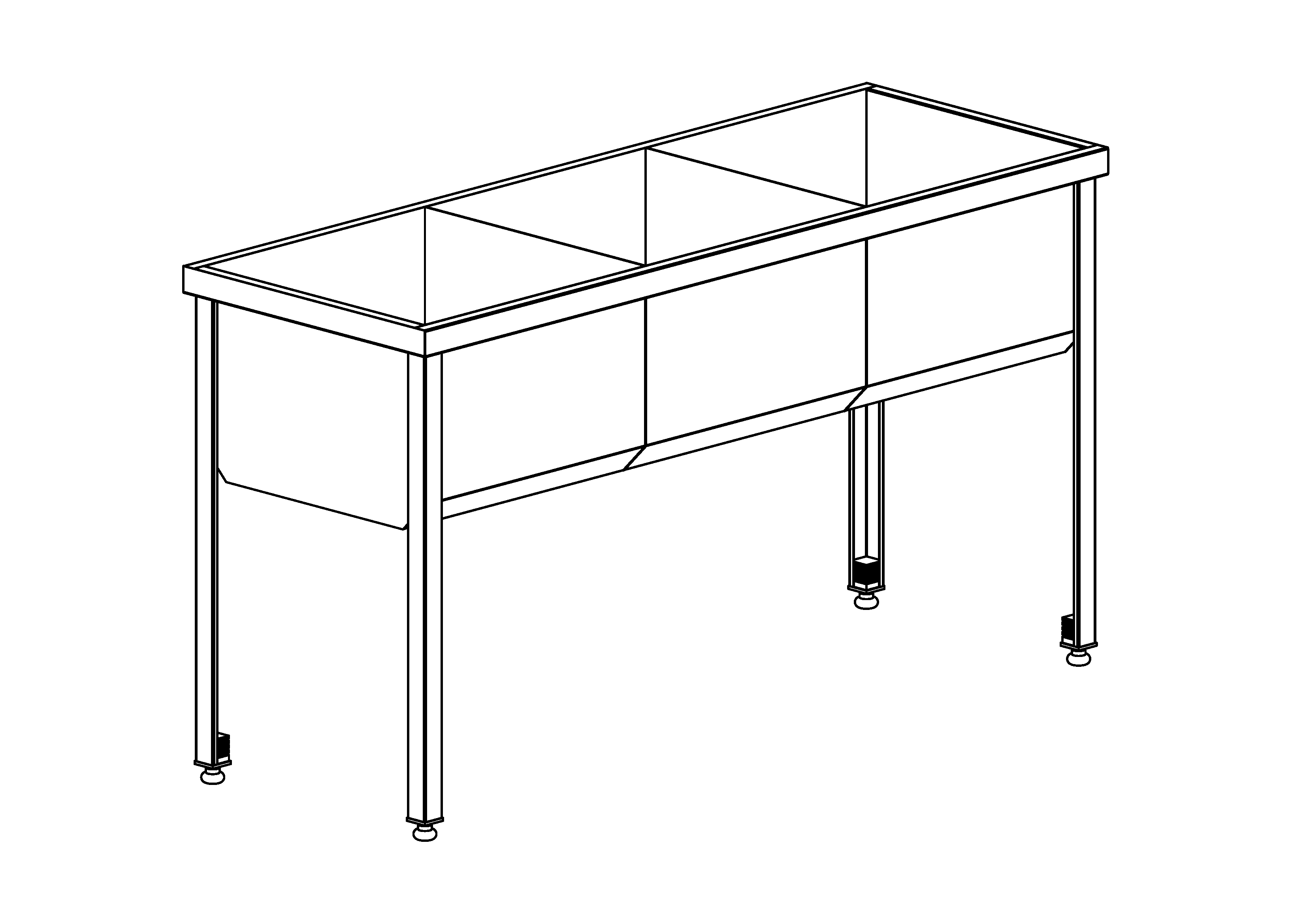 Ванна моечная без борта трёхсекционная. Емкость ванны сварная, выполненная из нерж. стали марки AISI 201, толщиной 0,8 мм. Имеет скошенное дно для удобства санитарной обработки. Размер секции - 500х500х350 мм. Без заднего борта, без отверстия под смеситель. Имеется отверстие для слива ф52 мм. Ножки съемные из нержавеющей стали толщиной 1,5 мм, с регулируемыми по высоте опорами. Смеситель и слив в комплект не входят.