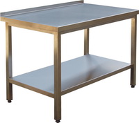 а также в качестве вспомогательной поверхности для кухонного оборудования: разборная конструкция, какркас выполнен из профильных элементов оцинкованной. стали толщиной 0,8 и 1,5 мм. Столешница выполнена с бортом (пристенного типа) из нерж. стали марки AISI 430 толщиной 0,6 мм и усилена подложкой из ДСП толщиной 16мм. Полка сплошная. Стол оснащен регулируемыми по высоте опорами. Габариты 1150*700*860 мм.
