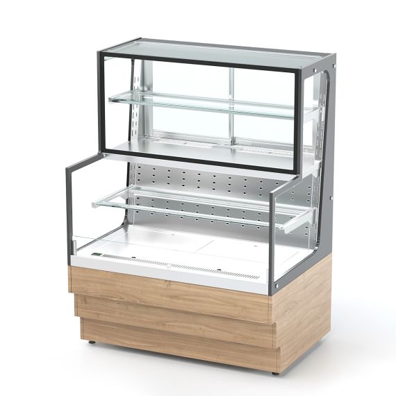 Кондитерская витрина торговой марки «Refettorio». Витрина комбинированная с охлаждаемой столешницей и внутренним охлаждаемым объемом открытого и закрытого доступа к продуктам, предназначена для эффектной демонстрации и хранения кондитерских изделий и десертов при температуре от +2°C до +8°C. Класс кондитерской витрины – среднетемпературный. В витрине имеется лоток для сбора конденсата с автоматическим выпариванием. Размещение пищевых продуктов полочное, четырёхъярусное. Доступ к продуктам в верхней части витрины осуществляется со стороны рабочего персонала с помощью раздвижных створок, в нижней части – со стороны потребителя, доступ открытый. Имеет освещение рабочей зоны над каждой полкой. В стандартный комплект фасады не поставляются (доп. опция). Ширина витрины, указанная в ее наименовании, не учитывает ширину фасадов. Полный габаритный размер по ширине указан в чертеже общего вида витрины.