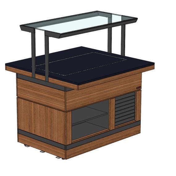Прилавок с охлаждаемой поверхностью относится к Шведским столам «Filin» торговой марки «Refettorio». Предназначен для кратковременного хранения пищевых продуктов, демонстрации и раздачи холодных закусок и охлажденных напитков потребителю. Класс прилавка высокотемпературный (от 1° до 10). Холодообеспечение встроенное. Тип оттаивания: естественный. Исполнение - островное. Столешница из искусственного камня. Прилавок оснащён стеклянными полками. Максимальная распределенная нагрузка на полку 15кг. Имеет светодиодную подсветку ниши фасадной части и подсветку рабочей зоны. Фасадные части могут быть с жалюзи и комбинированными ниша/фасад. В стандартный комплект поставки фасады не входят (доп. опция).