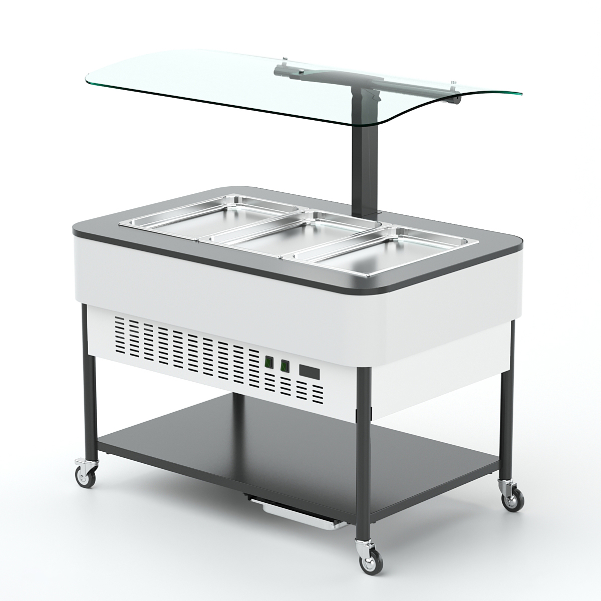 Прилавок холодильный относится к Шведским столам «Furshet» торговой марки «Refettorio». Предназначен для кратковременного хранения, демонстрации холодных блюд, закусок и салатов. Прилавок передвижной, оснащен колесами. Класс прилавка высокотемпературный (от 1° до 10). Холодообеспечение встроенное. Тип оттаивания: естественный. Исполнение - островное. Столешница из искусственного камня. Прилавок оснащён стеклянной полкой над столешницей. Снизу модуля имеется металлическая полка. Имеет светодиодную подсветку рабочей зоны. Количество гастроемкостей GN 1/1 (530х325) вмещающихся в прилавок – 3шт. В стандартный комплект поставки боковые фасады не входят (доп. опция.