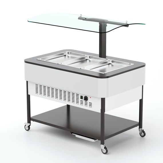 Мармит для вторых блюд относится к Шведским столам «Furshet» торговой марки «Refettorio». Мармит предназначен для кратковременного хранения в горячем состоянии вторых блюд в функциональных емкостях и раздачи их потребителю. Мармит передвижной, оснащен колесами. Исполнение - островное. Столешница из искусственного камня. Теплоноситель паровой. Тип электронагревательного устройства - пластинчатый электронагреватель (ПЭН). Температура нагрева регулируется с помощью автоматического терморегулятора. Мармит оснащён стеклянной полкой над столешницей. Снизу модуля имеется металлическая полка. Имеет светодиодную подсветку рабочей зоны. Количество гастроемкостей GN 1/1 (530х325) вмещающихся в мармит – 2шт. В стандартный комплект поставки гастроёмкости и фасады не входят (доп. опция).