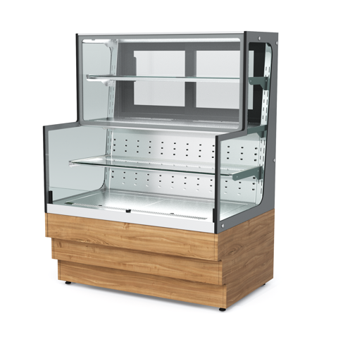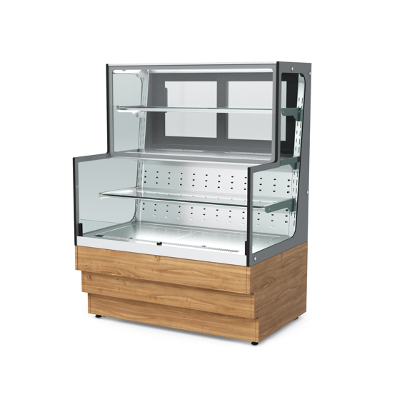 Кондитерская витрина торговой марки «Refettorio». Витрина комбинированная с охлаждаемой столешницей и внутренним охлаждаемым объемом открытого и закрытого доступа к продуктам, предназначена для эффектной демонстрации и хранения кондитерских изделий и десертов при температуре от +2°C до +8°C. Класс кондитерской витрины – среднетемпературный. В витрине имеется лоток для сбора конденсата с автоматическим выпариванием. Размещение пищевых продуктов полочное, четырёхъярусное. Доступ к продуктам в верхней части витрины осуществляется со стороны рабочего персонала с помощью раздвижных створок, в нижней части – со стороны потребителя, доступ открытый. Имеет освещение рабочей зоны над каждой полкой. В стандартный комплект фасады не поставляются (доп. опция). Ширина витрины, указанная в ее наименовании, не учитывает ширину фасадов. Полный габаритный размер по ширине указан в чертеже общего вида витрины.