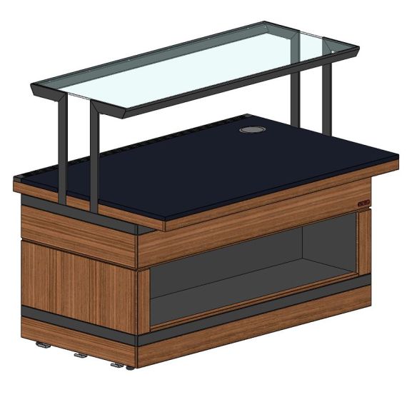 Прилавок нейтральный относится к относится к Шведским столам «Filin» торговой марки «Refettorio». Прилавок ниже стандартного на 100мм. Исполнение - пристенное. Столешница из искусственного камня со встроенной розеткой. Прилавок оснащён стеклянными полками. Максимальная распределенная нагрузка на стеклянную полку – 10 кг. Максимальная распределенная нагрузка на столешницу прилавка – 100 кг. Имеет светодиодную подсветку фасадной части и подсветку рабочей зоны. В стандартный комплект поставки боковые фасады не входят (доп. опция). В комплект входит фасад с нишей - Н.