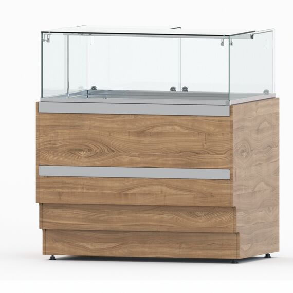Прилавок кондитерский нейтральный торговой марки «Refettorio». Прилавок с нейтральной столешницей закрытого доступа к продуктам. Доступ к продуктам со стороны рабочего персонала осуществляется с помощью раздвижных створок. Прилавок имеет выдвижной ящик для хранения кухонного инвентаря. Для лучшей демонстрации продукции предусмотрено освещение рабочей зоны со стороны рабочего персонала. Фасады в стандартный комплект поставки не входят (доп. опция). Ширина прилавка, указанная в ее наименовании, не учитывает ширину фасадов. Полный габаритный размер по ширине указан в чертеже общего вида прилавка.