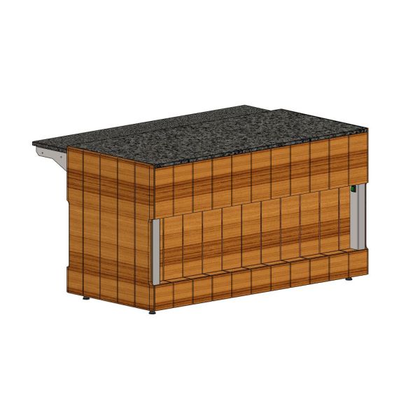 Фасад лицевой с 2-х сторон. Прилавок нейтральный относится к линии раздачи «Capital» торговой марки «Refettorio». Прилавок используется в качестве вспомогательного элемента. Столешница из искусственного камня. Имеет светодиодную подсветку в нише фасадной части. В стандартный комплект поставки направляющая и фасады не входят (доп. опция).