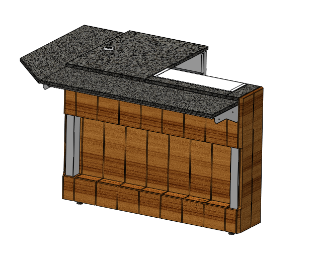 Прилавок Г-образный кассовый относится к линии раздачи «Capital» торговой марки «Refettorio». Прилавок предназначен для установки на него кассового аппарата для расчета с клиентами. Модуль выполнен в Г-образной форме, отсутствует правая стенка. Каменная столешница. Прилавок имеет левое исполнение (направление потока слева направо). Для удобства подключения кассовых приборов в нише прилавка вмонтированы две розетки с защитными крышками. На столешнице прилавка имеется две заглушки под кабель-канал. Предусмотрены специальные полки для размещения системного блока персонального компьютера. Имеет светодиодную подсветку в нише фасадной части. Как дополнительная опция прилавок может включать встроенный съемный денежный ящик, запираемый на ключ. В стандартный комплект поставки направляющая и фасады не входят (доп. опция).