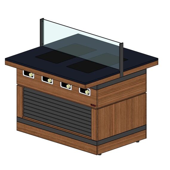 Прилавок относится к Шведским столам «Filin» торговой марки «Refettorio». В прилавок встроены 4 индукционные конфорки в 2 ряда. Мощность одной конфорки - 3 кВт. Ряды конфорок разграничены защитным стеклом высотой 30см. Не имеет полку над столешницей. Исполнение - островное. Столешница из искусственного камня. Имеет светодиодную подсветку фасадной части. В стандартный комплект поставки боковые фасады не входят (доп. опция). В комплект входят два лицевых фасада с жалюзи.