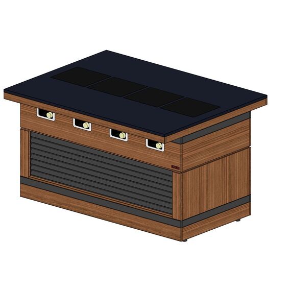 Прилавок относится к Шведским столам «Filin» торговой марки «Refettorio». В прилавок встроены 4 индукционные конфорки. Мощность одной конфорки - 3 кВт. Не имеет полку над столешницей. Исполнение - островное. Столешница из искусственного камня. Имеет светодиодную подсветку фасадной части. В стандартный комплект поставки боковые фасады не входят (доп. опция). В комплект входят два лицевых фасада с жалюзи.