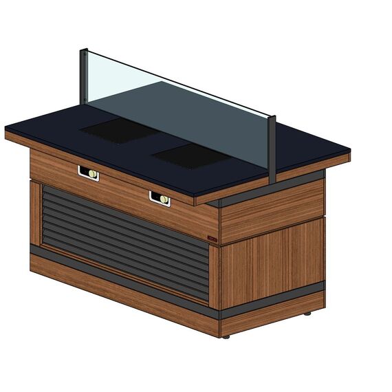 Прилавок относится к Шведским столам «Filin» торговой марки «Refettorio». В прилавок встроены 2 индукционные конфорки. Мощность одной конфорки - 3 кВт. Прилавок оснащен стеклянной перегородкой высотой 30см. Не имеет полку над столешницей. Исполнение - островное. Столешница из искусственного камня. Имеет светодиодную подсветку фасадной части. В стандартный комплект поставки боковые фасады не входят (доп. опция). В комплект входят два лицевых фасада с жалюзи.