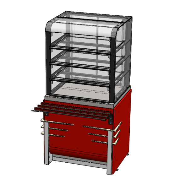 Витрина нейтральная относится к линии раздачи «Case» торговой марки «Refettorio». Размещение пищевых продуктов полочное четырёхъярусное, включая дно полезного объёма. Столешница из нержавеющей стали. Доступ к продуктам со стороны рабочего персонала осуществляется с помощью раздвижных створок витрины, со стороны потребителя доступ к продуктам отсутствует. Максимальная распределенная нагрузка на стеклянную полку 5кг. Со стороны персонала в витрине есть ниша для инвентаря и розетка с защитной крышкой - 1шт. Как дополнительная опция ниша может быть снабжена полкой и створчатой дверкой. Имеет светодиодную подсветку в нише фасадной части и подсветку витрины.