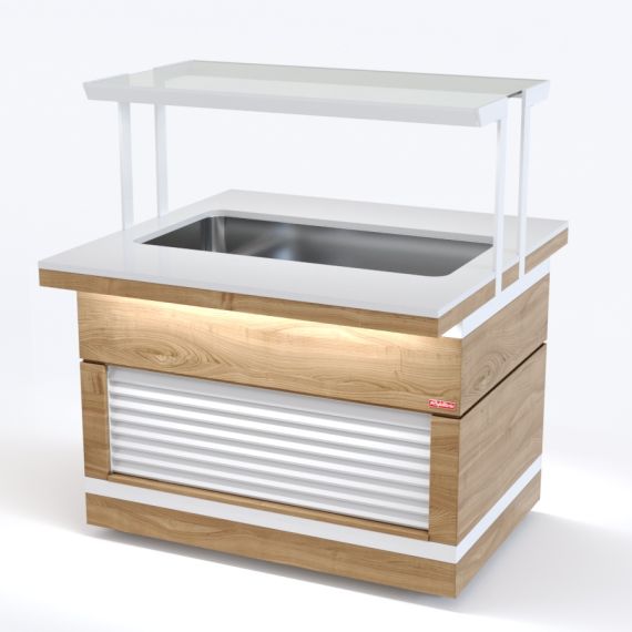 Прилавок "рыба на льду" относится к Шведским столам «Filin» торговой марки «Refettorio». Прилавок предназначен для кратковременного хранения и демонстрации охлажденных и замороженных продуктов на предприятиях торговли и общественного питания. Исполнение - островное. Специфика данного прилавка в том, что выкладка охлажденного продукта происходит на "подушку" из ледяной крошки. Благодаря толстому слою льда, продукция сохраняет свежесть и необходимый товарный вид более длительное время. Для прилавков «рыба на льду» применяется, как правило, чешуйчатый или гранулированный лед. Прилавок оснащён стеклянной полкой. Максимальная распределенная нагрузка на стеклянную полку 10кг. Имеет светодиодную подсветку в нише фасадной части и подсветку рабочей зоны. В стандартный комплект поставки боковые фасады не входят (доп. опция). В комплект входит: ЖЖ - 2 фасада с жалюзи.