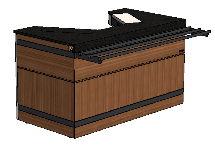 Прилавок кассовый правый линии раздачи «Filin» торговой марки Refettorio. Прилавок предназначен для установки на него кассового аппарата и расчета с клиентами. Прилавок имеет правое исполнение (направление потока справа на лево). Для удобства подключения кассовых приборов в нише прилавка вмонтированы четыре розетки. На столешнице прилавка имеется два отверстия с заглушками под кабель-канал. Предусмотрена специальная полка для размещения системного блока персонального компьютера. Столешница: искусственный камень (кварцевый агломерат) - прочный износостойкий материал Подсветка: светодиодная подсветка фасадной части 3000 К Стандартная комплектация: прилавок, лицевой фасад из МДФ, направляющая для подносов из крашеной стали, встроенный съемный денежный ящик, запираемый на ключ. Дополнительные опции (не входят в комплект поставки): боковые фасады.