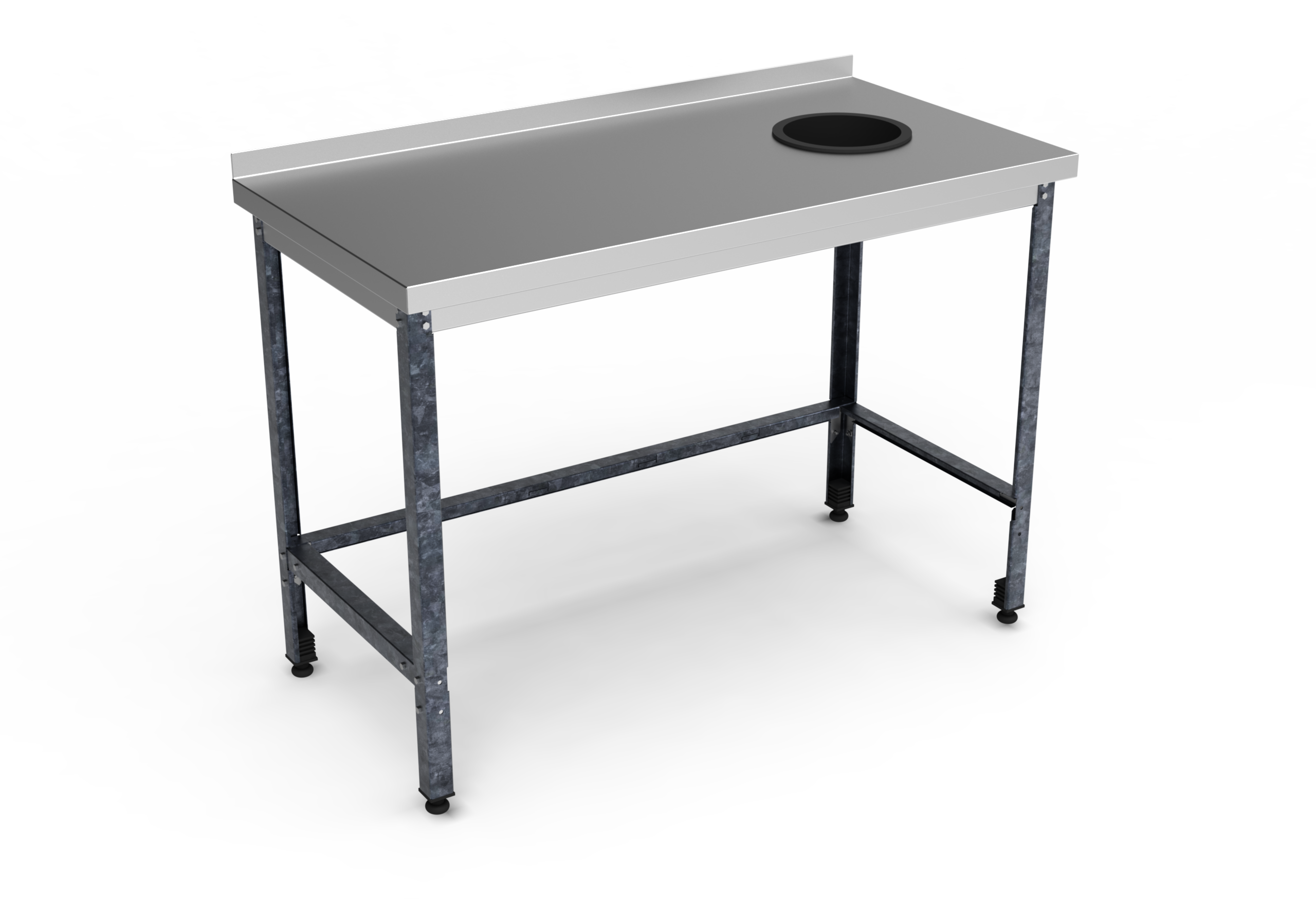 Серия СПН: стол для сбора отходов имеет разборную конструкцию, каркас выполнен из профильных элементов нерж. стали марки AISI 430 толщиной 1,2 мм. Столешница с бортом выполнена из нерж. стали марки AISI 430 толщиной 0,8 мм и усилена подложкой из ДСП толщиной 16 мм. В столешнице имеет отверстие для сбора отходов диаметром 200 мм. Столешница имеет задний борт (пристенный тип). Вместо полки выполнена обвязка с 3х сторон. Стол оснащен регулируемыми по высоте опорами. Габариты: 800*600*860.