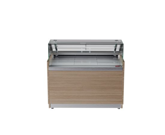 Витрина закрытая, универсальный темп. режим, серия MARTA торговой марки Refettorio. Температурный режим можно установить в диапазоне -6…+6°C. Встроенный холодильный агрегат. Охлаждение динамическое. Электронный контроллер с функцией автоматической «умной» оттайки ТЭНами. Автоматическое выпаривания конденсата. Верхняя LED-подсветка. Размер выкладки 650мм. Трансформируемая выкладка позволяет установить поддоны на разной высоте и с разным углом наклона. Направляющие для установки гастроёмкостей входят в комплектацию. Верхняя стеклянная полка поднимается вверх и фронтальное стекло открывается вперёд для удобства обслуживания и ухода за витриной. Внешние и внутренние поверхности витрины выполнены из нержавеющей стали AISI 430: стойки и кронштейны, поддоны выкладки, внутренняя ванна витрины, цоколь и др. Столешница выполнена из текстурированной нержавеющей стали. Задние раздвижные дверки, фронтальные и боковые декоративные панели не входят в стандартную комплектацию.