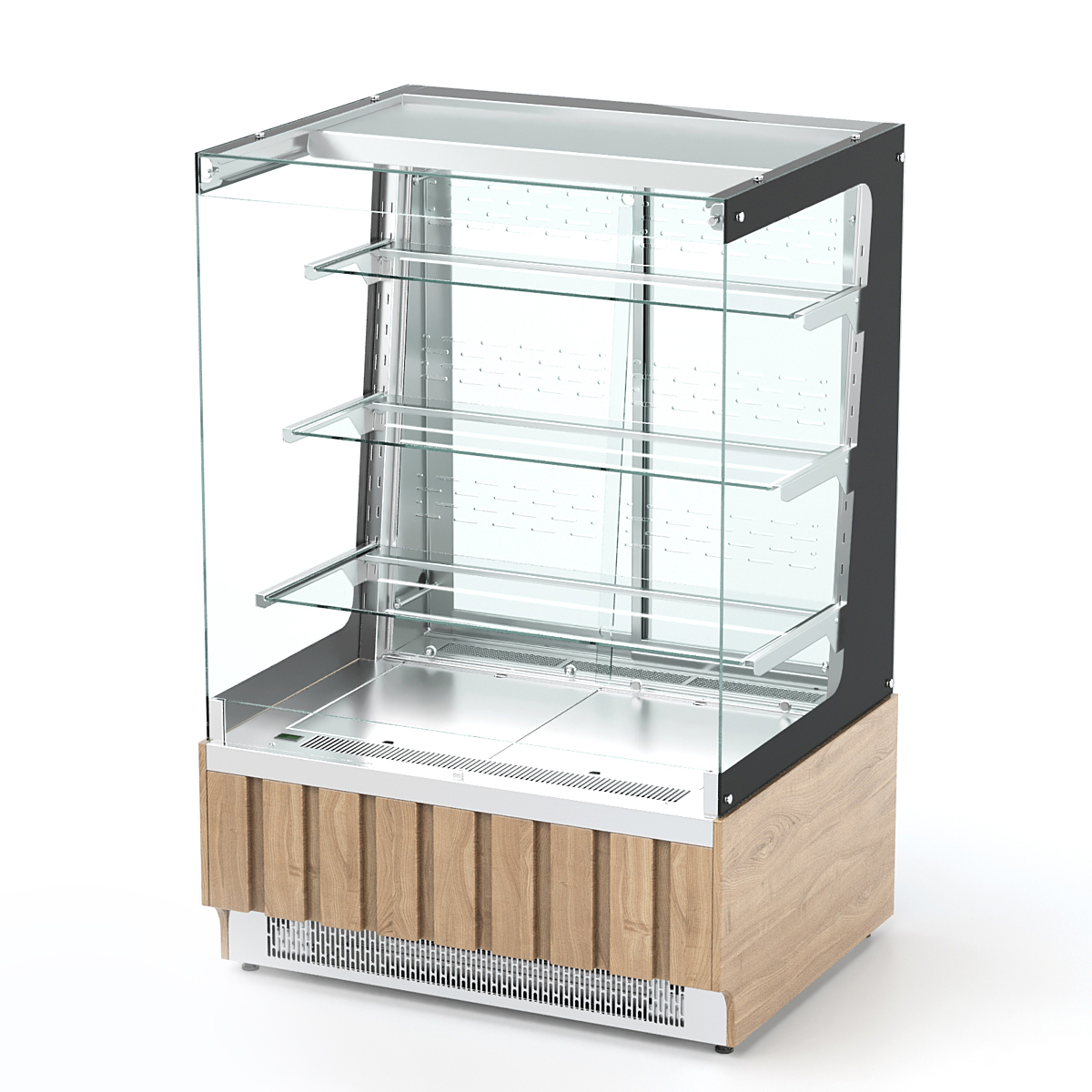 Кондитерская витрина торговой марки «Refettorio». Витрина с охлаждаемой столешницей и внутренним охлаждаемым объемом открытого доступа к продуктам, предназначена для эффектной демонстрации и хранения кондитерских изделий и десертов при температуре от +2°C до +8°C. Класс кондитерской витрины – среднетемпературный. Размещение пищевых продуктов полочное, четырёхъярусное. Доступ к продуктам осуществляется с помощью раздвижных створок витрины со стороны рабочего персонала. Доступ со стороны потребителя открытый. Имеет освещение рабочей зоны над каждой полкой. В стандартный комплект поставки боковые стёкла в витрину и фасады не поставляются (доп. опция). Ширина витрины, указанная в ее наименовании, не учитывает ширину фасадов. Полный габаритный размер по ширине указан в чертеже общего вида витрины.