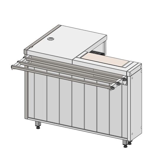 Прилавок кассовый относится к линии раздачи «City» торговой марки «Refettorio». Прилавок предназначен для установки на него кассового аппарата для расчета с клиентами. Модуль выполнен в Г-образной форме, отсутствует правая стенка. Столешница из нержавеющей стали. Прилавок имеет левое исполнение (направление потока слева направо). Для удобства подключения кассовых приборов в нише прилавка вмонтированы две розетки с защитными крышками. На столешнице прилавка имеется заглушка под кабель-канал. Предусмотрена специальная полка для размещения системного блока персонального компьютера. Имеет светодиодную подсветку в нише фасадной части. В стандартный комплект поставки направляющая и фасады не входят (доп. опция).