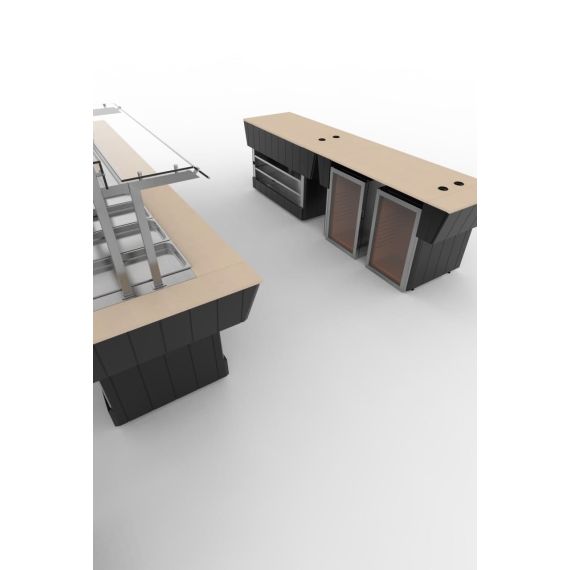 Нейтральный прилавок без полки (шведский стол пристенный) с нишей для встраиваемого оборудования с каменной столешницей размером (1105х720х830) мм. Без каменных направляющих. Под модуль устанавливаются два холодильника https://entero. ru/item/122576. одно отверстие для кабель канала в столешнице.