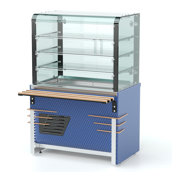 Витрина тепловая относится к линии раздачи «Case» торговой марки «Refettorio». Витрина с внутренним тепловым объемом, предназначена для эффектной демонстрации и временного хранения готовых горячих блюд и выпечки. Столешница из нержавеющей стали. Рабочая температура витрины от 30° до 60°. В корпусе прилавка установлен ТЭН (трубчатый электронагреватель). Размещение пищевых продуктов полочное четырёхъярусное, включая дно полезного объёма. Доступ к продуктам со стороны рабочего персонала осуществляется с помощью раздвижных створок витрины, со стороны потребителя доступ через откидные крышки. Максимальная распределенная нагрузка на стеклянную полку 5кг. Имеет светодиодную подсветку ниши фасадной части и подсветку витрины. Имеется розетка с защитной крышкой - 1шт. Как дополнительная опция ниша прилавка может быть снабжена створчатой дверкой. В стандартный комплект поставки направляющая и фасады не входят (доп. опция). Ширина витрины, указанная в ее наименовании, не учитывает ширину фасадов (см. чертеж общего вида).