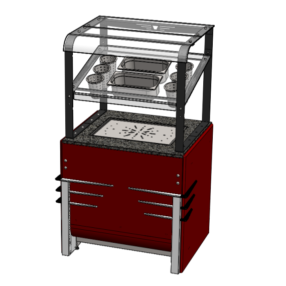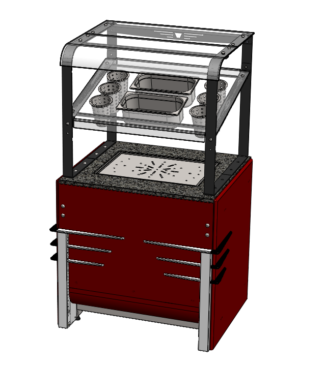 Диспенсер для подносов и столовых приборов относится к линии раздачи «Case» торговой марки «Refettorio». Столешница из искусственного камня со встроенным с лифтом для подносов. В стеклянную полку встроены стаканы 6 шт и 2 гастроемкости GN 1/2 Н65. Имеется дополнительная стеклянная полка сверху прилавка. Прилавок имеет светодиодную подсветку фасадной части. Прилавок со стороны рабочего персонала оснащён розеткой для подключения дополнительного оборудования. В стандартный комплект поставки направляющая и фасады не входят (доп. опция).