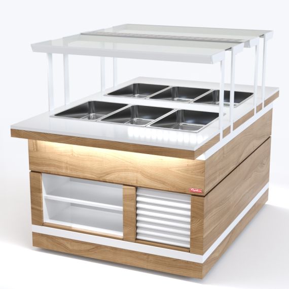 Прилавок холодильный относится к Шведским столам «Filin» торговой марки «Refettorio». Предназначен для кратковременного хранения, демонстрации холодных блюд, закусок и салатов. Класс прилавка высокотемпературный (от 1° до 10). Холодообеспечение встроенное. Тип оттаивания: естественный. Исполнение - сдвоенное. Столешница из искусственного камня. Прилавок оснащён стеклянными полками. Максимальная распределенная нагрузка на полку 15кг. Имеет светодиодную подсветку ниши фасадной части и подсветку рабочей зоны. В стандартный комплект поставки гастроёмкости и боковые фасады не входят (доп. опция). В комплект входит: Ж - фасад с жалюзи К - фасад комбинированный ниша/жалюзи.