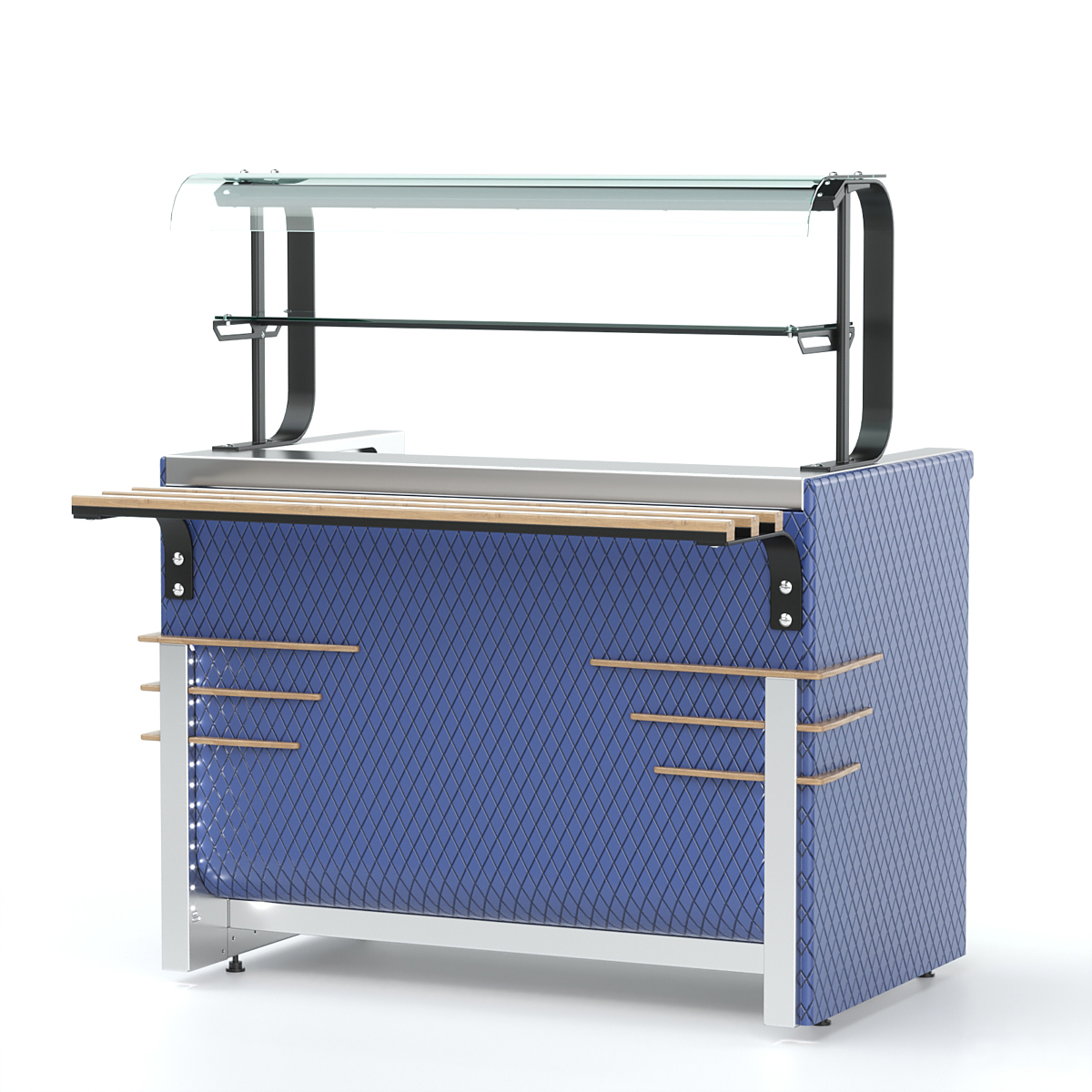 Прилавок нейтральный П-образный относится к линии раздачи «Case» торговой марки «Refettorio». Столешница выполнена с вырезом и имеет П-образную форму. Столешница из нержавеющей стали. Для удобства подключения электроприборов на панели прилавка вмонтированы розетки с защитными крышками. Прилавок оснащен стеклянными полками. Максимальная распределенная нагрузка на стеклянную полку 5кг. Имеет светодиодную подсветку в нише фасадной части и подсветку рабочей зоны. В стандартный комплект поставки направляющая и фасады не входят (доп. опция). Ширина прилавка, указанная в ее наименовании, не учитывает ширину фасадов. Полный габаритный размер по ширине указан в чертеже общего вида прилавка.