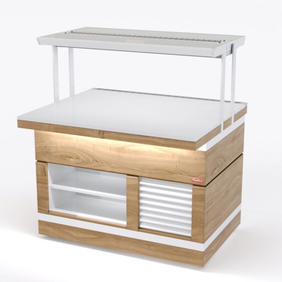 Мармит с инфракрасным нагревом относится к Шведским столам «Filin» торговой марки «Refettorio». Мармит предназначен для поддержания температуры готовых блюд перед раздачей на таких объектах как: рестораны, кафе, столовые, гостиницы с питанием «шведский стол», фудкорты и т. д. Исполнение - пристенное. Мармит оснащён стеклянной полкой со встроенным инфракрасным излучателем. Температурный диапазон на поверхности стола 40-60 С°. Максимальная распределенная нагрузка на стеклянную полку 10кг. Имеет светодиодную подсветку в нише фасадной части и подсветку рабочей зоны. В стандартный комплект поставки боковые фасады не входят (доп. опция). В комплект входит: К - фасад комбинированный ниша/жалюзи.