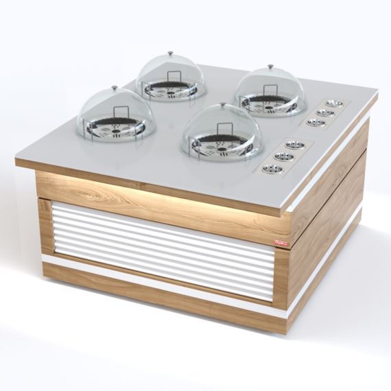 Прилавок диспенсер для тарелок тепловой относится к Шведским столам «Filin» торговой марки «Refettorio». Диспенсер предназначен для обеспечения клиентов тарелками и столовыми приборами. Исполнение - сдвоенное. Столешница из искусственного камня. Диспенсер снабжен выталкивающим устройством - лифт и шестью стакнами для столовых приборов. Количество лифтов - 2шт. Шахта лифта оснащена подогревом. Тип электронагревательного устройства – трубчатый электронагреватель (ТЭН). Режим терморегулирования от 30 до 90°С. В комплект входит крышка-купол из оргстекла. Имеет светодиодную подсветку фасадной части. В стандартный комплект поставки боковые фасады не входят (доп. опция). В комплект входит: ЖЖ - 2 фасада с жалюзи.