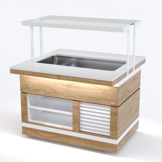 Прилавок "рыба на льду" относится к Шведским столам «Filin» торговой марки «Refettorio». Прилавок предназначен для кратковременного хранения и демонстрации охлажденных и замороженных продуктов на предприятиях торговли и общественного питания. Исполнение - островное. Специфика данного прилавка в том, что выкладка охлажденного продукта происходит на "подушку" из ледяной крошки. Благодаря толстому слою льда, продукция сохраняет свежесть и необходимый товарный вид более длительное время. Для прилавков «рыба на льду» применяется, как правило, чешуйчатый или гранулированный лед. Прилавок оснащён стеклянной полкой. Максимальная распределенная нагрузка на стеклянную полку 10кг. Имеет светодиодную подсветку в нише фасадной части и подсветку рабочей зоны. В стандартный комплект поставки боковые фасады не входят (доп. опция). В комплект входит: КК - 2 фасада комбинированных ниша/фасад.