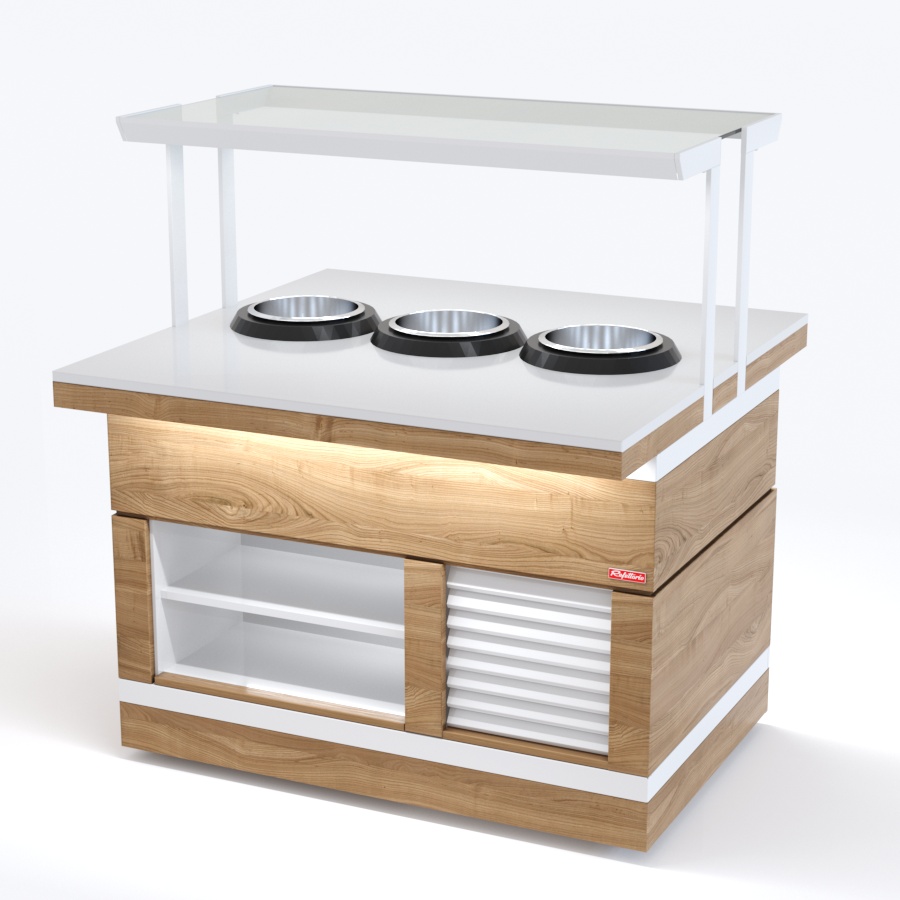 Мармит для первых блюд относится к Шведским столам «Filin» торговой марки «Refettorio». Мармит предназначен для поддержания в горячем состоянии емкостей с первыми блюдами и раздачи их потребителю. Исполнение - островное. Вместимость супницы - 10 литров. Электросупницы - 3шт. Терморегулятор от 0 до 95С°. Мармит оснащён стеклянной полкой. Максимальная распределенная нагрузка на стеклянную полку 10кг. Имеет светодиодную подсветку в нише фасадной части и подсветку рабочей зоны. В стандартный комплект поставки боковые фасады не входят (доп. опция). В комплект входит: Ж - фасад с жалюзи К - фасад комбинированный ниша/фасад.