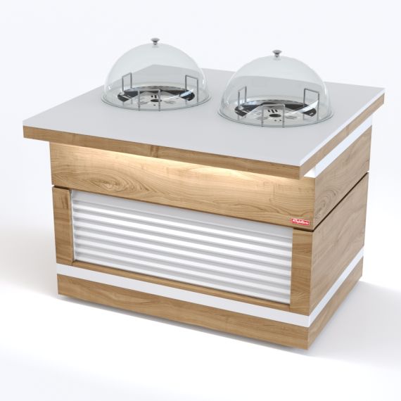 Прилавок диспенсер для тарелок тепловой относится к Шведским столам «Filin» торговой марки «Refettorio». Диспенсер предназначен для обеспечения клиентов тарелками. Исполнение - островное. Столешница из искусственного камня. Диспенсер снабжен выталкивающим устройством - лифт. Количество лифтов - 2шт. Шахта лифта оснащена подогревом. Тип электронагревательного устройства – трубчатый электронагреватель (ТЭН). Режим терморегулирования от 30 до 90°С. В комплект входит крышка-купол из оргстекла. Имеет светодиодную подсветку фасадной части. В стандартный комплект поставки боковые фасады не входят (доп. опция). В комплект входит: Ж - фасад с жалюзи.
