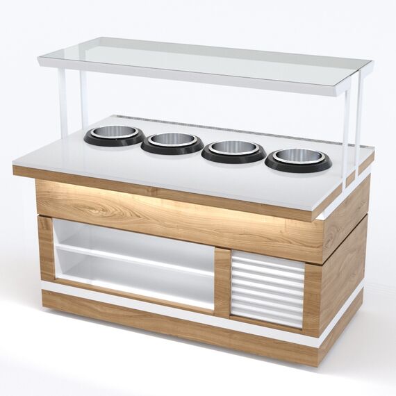 Мармит для первых блюд относится к Шведским столам «Filin» торговой марки «Refettorio». Мармит предназначен для поддержания в горячем состоянии емкостей с первыми блюдами и раздачи их потребителю. Исполнение - пристенное. Вместимость супницы - 10 литров. Электросупницы - 4шт. Терморегулятор от 0 до 95С°. Мармит оснащён стеклянной полкой. Максимальная распределенная нагрузка на стеклянную полку 10кг. Имеет светодиодную подсветку в нише фасадной части и подсветку рабочей зоны. В стандартный комплект поставки боковые фасады не входят (доп. опция). В комплект входит комбинированный фасад ниша/жалюзи - К.