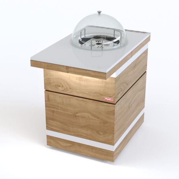 Прилавок диспенсер для тарелок тепловой относится к Шведским столам «Filin» торговой марки «Refettorio». Диспенсер предназначен для обеспечения клиентов тарелками. Исполнение - пристенное. Столешница из искусственного камня. Диспенсер снабжен выталкивающим устройством - лифт. Количество лифтов - 1шт. Шахта лифта оснащена подогревом. Тип электронагревательного устройства – трубчатый электронагреватель (ТЭН). Режим терморегулирования от 30 до 90°С. В стандартный комплект поставки боковые фасады не входят (доп. опция). В комплект входит крышка-купол из оргстекла и слошной фасад - С.