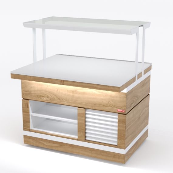 Прилавок нейтральный относится к относится к Шведским столам «Filin» торговой марки «Refettorio». Прилавок используется в качестве вспомогательного элемента. Исполнение - пристенное. Столешница из искусственного камня. Максимальная распределенная нагрузка на столешницу прилавка – 100 кг. Имеет светодиодную подсветку фасадной части. В стандартный комплект поставки боковые фасады не входят (доп. опция). В комплект входит комбинированный фасад ниша/жалюзи - К.