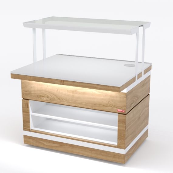 Прилавок нейтральный относится к относится к Шведским столам «Filin» торговой марки «Refettorio». Прилавок используется в качестве вспомогательного элемента. Исполнение - пристенное. Столешница из искусственного камня со встроенной розеткой. Прилавок оснащён стеклянными полками. Максимальная распределенная нагрузка на стеклянную полку – 10 кг. Максимальная распределенная нагрузка на столешницу прилавка – 100 кг. Имеет светодиодную подсветку фасадной части и подсветку рабочей зоны. В стандартный комплект поставки боковые фасады не входят (доп. опция). В комплект входит фасад с нишей - Н.