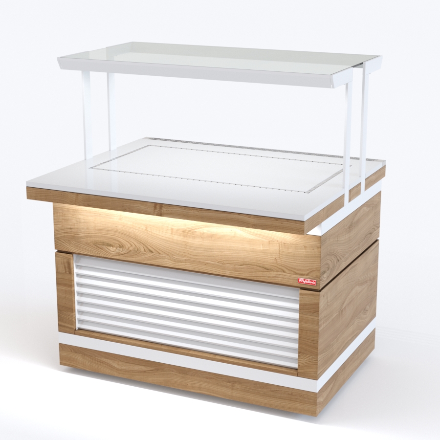 Прилавок с охлаждаемой поверхностью относится к Шведским столам «Filin» торговой марки «Refettorio». Предназначен для кратковременного хранения пищевых продуктов, демонстрации и раздачи холодных закусок и охлажденных напитков потребителю. Класс прилавка высокотемпературный (от 1° до 10). Холодообеспечение встроенное. Тип оттаивания: естественный. Исполнение - пристенное. Столешница из искусственного камня. Прилавок оснащён стеклянными полками. Максимальная распределенная нагрузка на полку 10кг. Имеет светодиодную подсветку ниши фасадной части и подсветку рабочей зоны. В стандартный комплект поставки боковые фасады не входят (доп. опция). В комплект входит фасад с жалюзи - Ж.