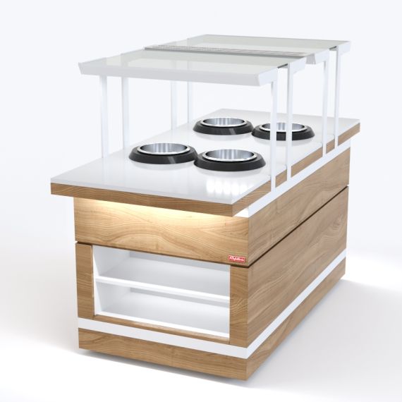 Мармит для первых блюд относится к Шведским столам «Filin» торговой марки «Refettorio». Мармит предназначен для поддержания в горячем состоянии емкостей с первыми блюдами и раздачи их потребителю. Исполнение - сдвоенное. Вместимость супницы - 10 литров. Электросупницы - 4шт. Терморегулятор от 0 до 95С°. Мармит оснащён стеклянной полкой. Максимальная распределенная нагрузка на стеклянную полку 10кг. Имеет светодиодную подсветку в нише фасадной части и подсветку рабочей зоны. В стандартный комплект поставки боковые фасады не входят (доп. опция). В комплект входит: Ж - фасад с жалюзи Н - фасад с нишей.