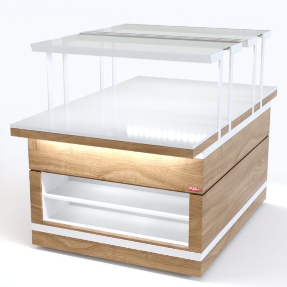 Прилавок нейтральный относится к относится к Шведским столам «Filin» торговой марки «Refettorio». Прилавок используется в качестве вспомогательного элемента. Исполнение - сдвоенное. Столешница из искусственного камня. Прилавок оснащён стеклянными полками. Максимальная распределенная нагрузка на стеклянную полку – 10 кг. Максимальная распределенная нагрузка на столешницу прилавка – 100 кг. Имеет светодиодную подсветку в нише фасадной части и подсветку рабочей зоны. В стандартный комплект поставки боковые фасады не входят (доп. опция). В комплект входит: НН - 2 фасада с нишей.