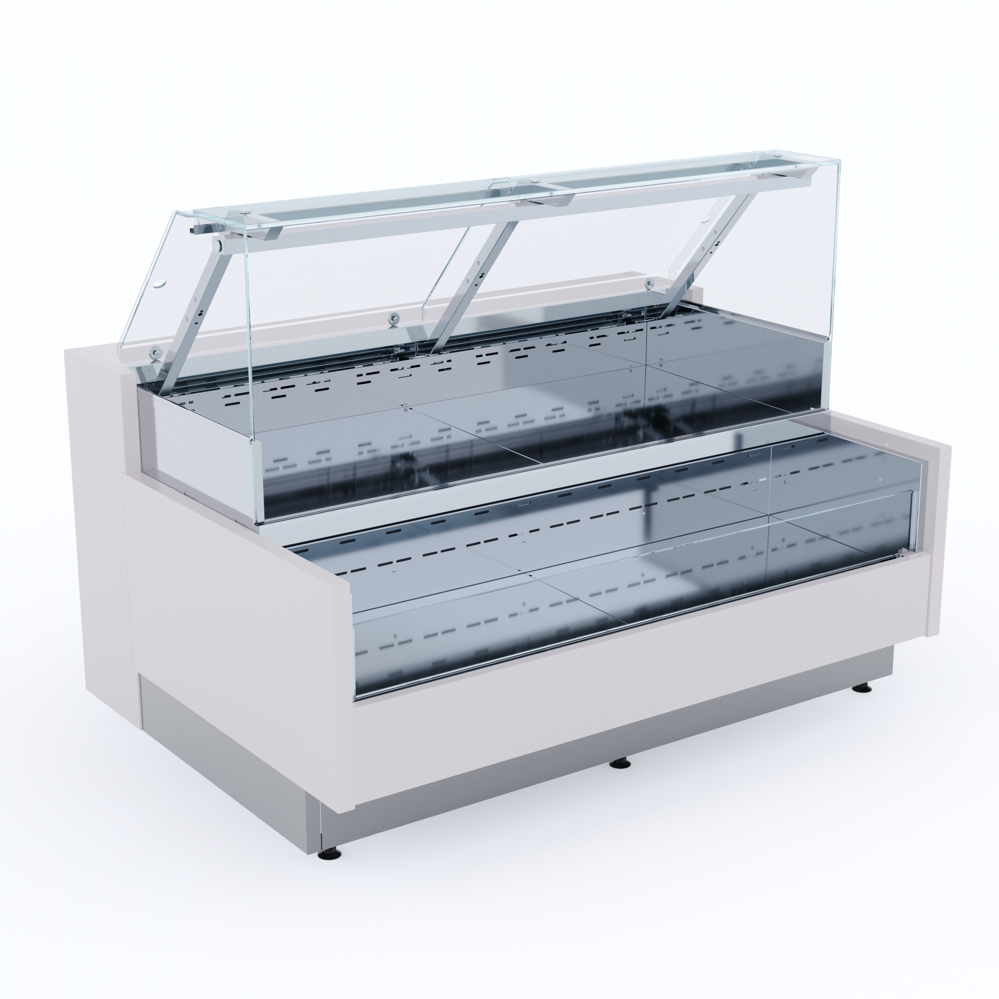 Витрина гастрономическая с выносным холодом закрытая относится к гастрономической линии «Vista» торговой марки «Refettorio». Температурный режим +2…+6°C. Витрина предназначена для подключения к внешнему агрегату. Охлаждение вентилируемое — система «нежного» обдува SOFTCOOL. Верхняя двойная LED-подсветка — два ряда светодиодной ленты. Фронтальное стекло и передняя панель открываются с помощью газлифтов для удобства обслуживания и ухода за витриной. Имеется система обдува фронтального стекла против запотевания. Электронный контроллер с функцией автоматической «умной» оттайки. Дополнительно установлена система выпаривания конденсата. Все внешние и внутренние поверхности из нержавеющей стали AISI 430: стойки и кронштейны, корпус витрины, поддоны выкладки, задняя стенка и цоколь. Столешница выполнена из текстурированной нержавеющей стали. Фронтальные и боковые панели не входят в стандартную комплектацию.