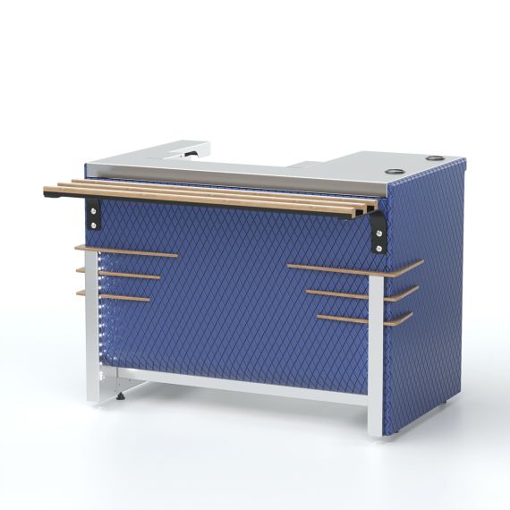 Прилавок имеет светодиодную подсветку 3000К. Прилавок кассовый относится к линии раздачи «Case» торговой марки «Refettorio». Прилавок предназначен для установки на него кассового аппарата для расчета с клиентами. Столешница из нержавеющей стали. Прилавок имеет правое исполнение (направление потока справа на лево). Для удобства подключения кассовых приборов в нише прилавка вмонтированы две розетки с защитными крышками. На столешнице прилавка имеется две заглушки под кабель-канал. Предусмотрены специальные полки для размещения системного блока персонального компьютера. Имеет светодиодную подсветку в нише фасадной части. Как дополнительная опция прилавок может включать встроенный съемный денежный ящик, запираемый на ключ. В стандартный комплект поставки направляющая и фасады не входят (доп. опция).