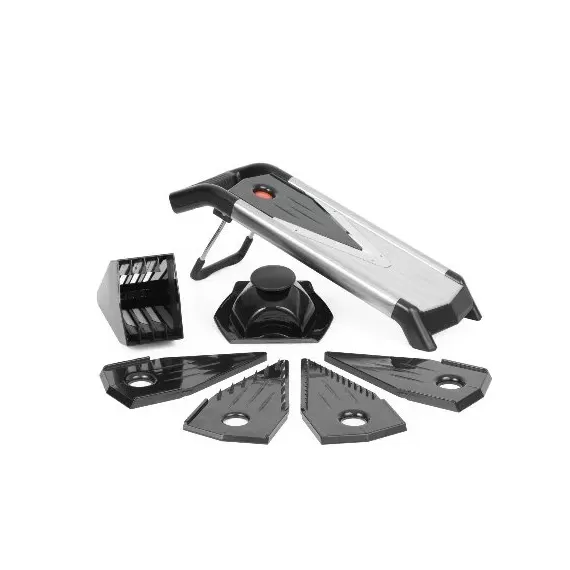 Материал: лезвия - нерж.сталь, корпус - сталь/пластик. В комплект входит: 2 лезвия для нарезки, 3 напрявляющих с различной толщиной 1 мм/2 мм/3 мм, нескользящие резиновые ножки.