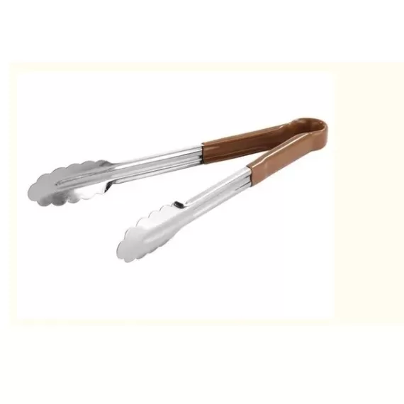 Щипцы 358.406 универсальные изготовлены из нержавеющей стали 18/10 с пластиковой ручкой коричнего цвета. Длина изделия - 40 см.