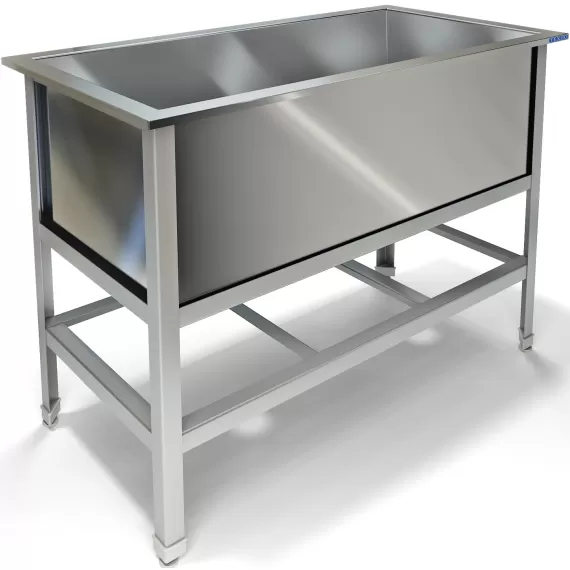 Одна емкость сварная размером 900х430х300 из нержавеющей стали марки AISI 304 толщиной 0,8мм. Каркас сварной из уголка 40х40 толщиной 2мм, покрытого порошковой краской серого цвета, внизу по периметру обвязка. Ванна комплектуется выпуском с нержавеющей решеткой и механическим запорным клапаном, диаметр выпуска 90мм, диаметр подключаемого сифона 50мм, регулируемые опоры. На дне ванны ребра (лучи) для жесткости и снижения вибрации. Ванна поставляется в собранном виде.