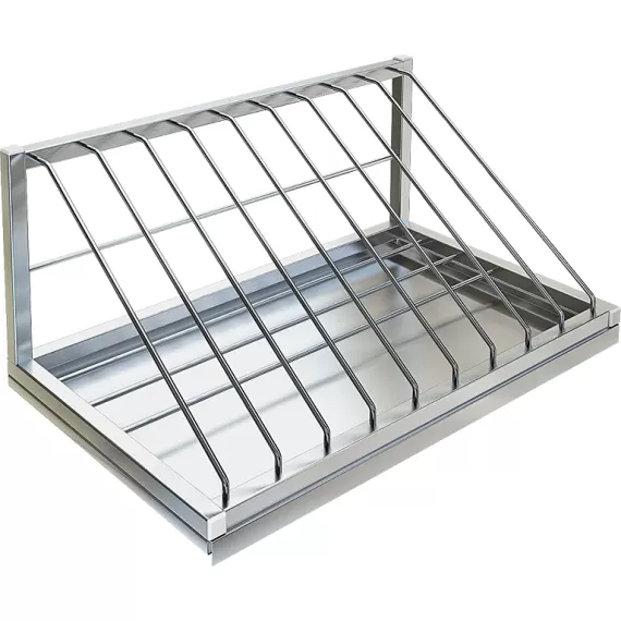 Полка навесная ПН-117/600 для досок, 600х350х270 мм. Полка настенная сварная из нержавеющей стали AISI 304, 9 секций на 9 досок, выполнена из трубы 20х20 и прутка