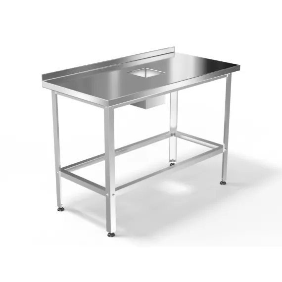 Стол для сбора отходов с бортом серия Стандарт, 600х600х850, подложка ЛДСП 16 мм, столешница: нерж. сталь марки AISI 430, толщина 0,8 мм, каркас разборный, оцинкованный уголок 1,5 мм, обвязка с 3-х сторон, отверстие d=200 мм.