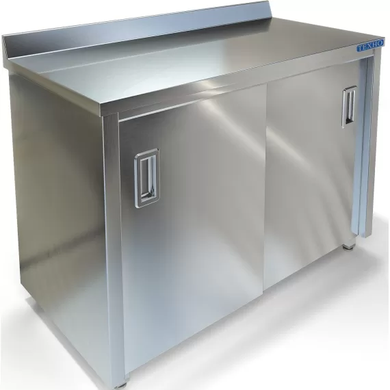 Стол производственный (стол-тумба) СП, мод. СПС-934/1200Н с бортом. Столешница из нержавеющей стали марки AISI 430 толщиной 0,8мм, ЛДСП толщиной 32 мм. Корпус и две двери-купе из нержавеющей стали марки AISI 430 толщиной 0,8мм. Полка из нержавеющей стали марки AISI 430 толщиной 0,8мм. Задняя стенка из нержавеющей стали марки AISI 430 толщиной 0,8мм. Стол поставляется в собранном виде. 1200х600х850мм