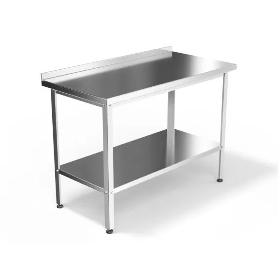 Стол производственный с бортом серия Стандарт +, 1600х700х850, подложка ЛДСП 16 мм, столешница: нерж. сталь марки AISI 430, толщина 0,8 мм, каркас разборный, нерж. уголок AISI 430 1,5 мм, сплошная полка